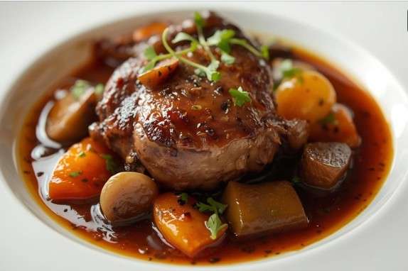 - 2nd: Coq au vin. Red wine braised chicken with mushrooms and pearl onions, served with pomme puree