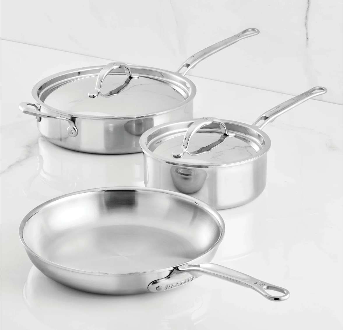 The Signature Set features an 11-inch skillet, 2-quart saucepan with lid, and 3.5-quart sauté pan with lid delivers everyday versatility and performance, ideal for searing, simmering, and sautéing with a brilliant mirror polished finish.