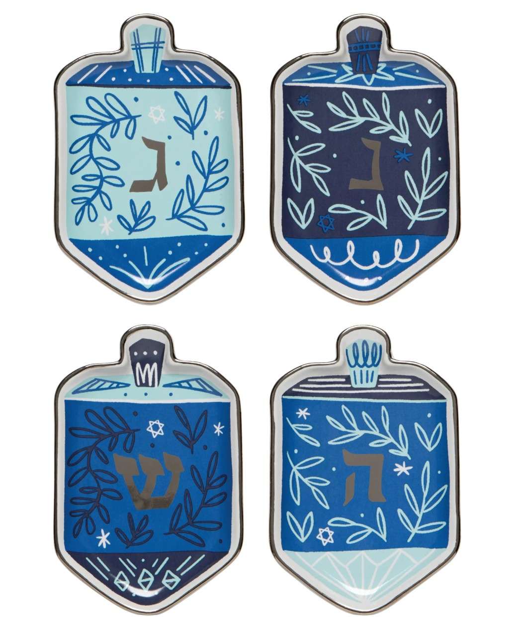 Embellished dishes are great for appetizers or trinkets. Fun-loving Dreidel shapes make for excellent conversation, no matter their use. Designed from scratch by our creative team and are unique to Danica Jubilee. In shades of blue and glints of metallic foil, whirling dreidels take center stage and add a playful touch for your Hannukah celebration.