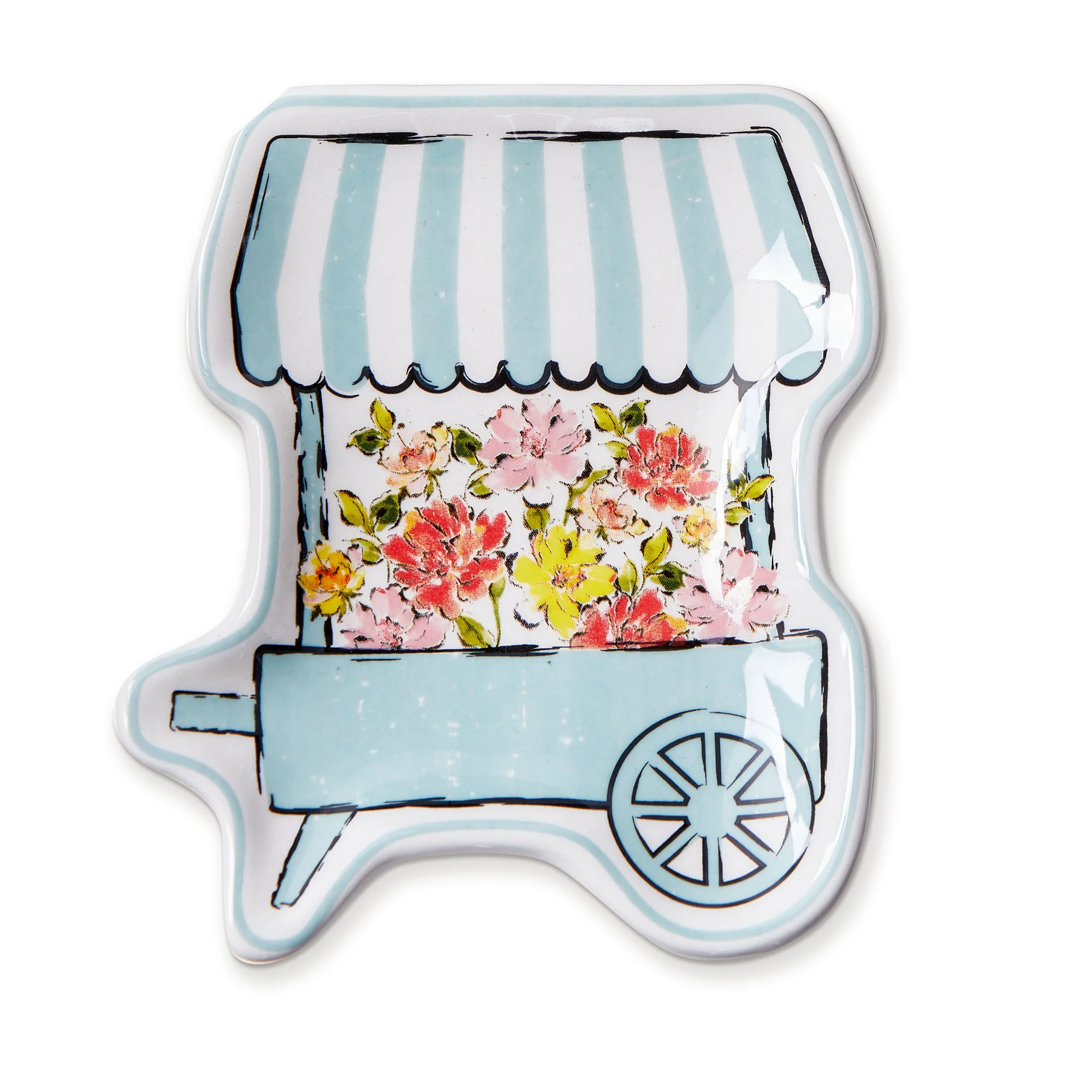 A charming ceramic trinket dish shaped like a flower cart with a blue and white striped banner and colorful flowers inside, making it a wonderful gift.