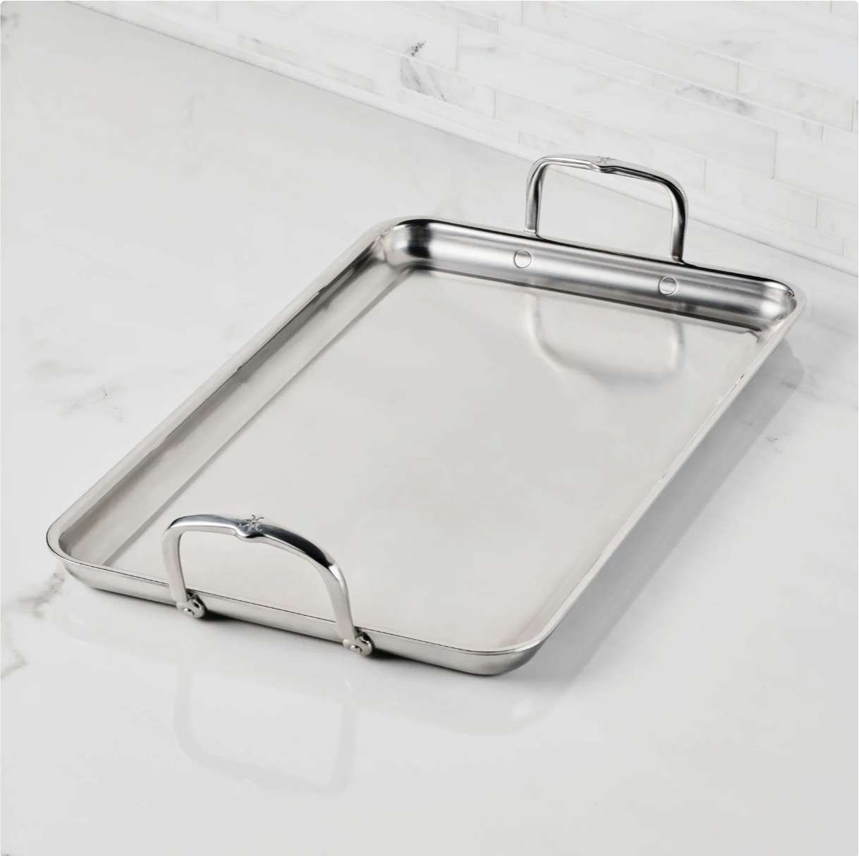 Engineered for versatility and performance, this 21-inch x 13inch Double Burner Griddle features a tri-ply stainless steel construction with a thick aluminum core to deliver unrivaled heat distribution over two stovetop burners for flawless brunch spreads to perfectly pressed smash burgers.