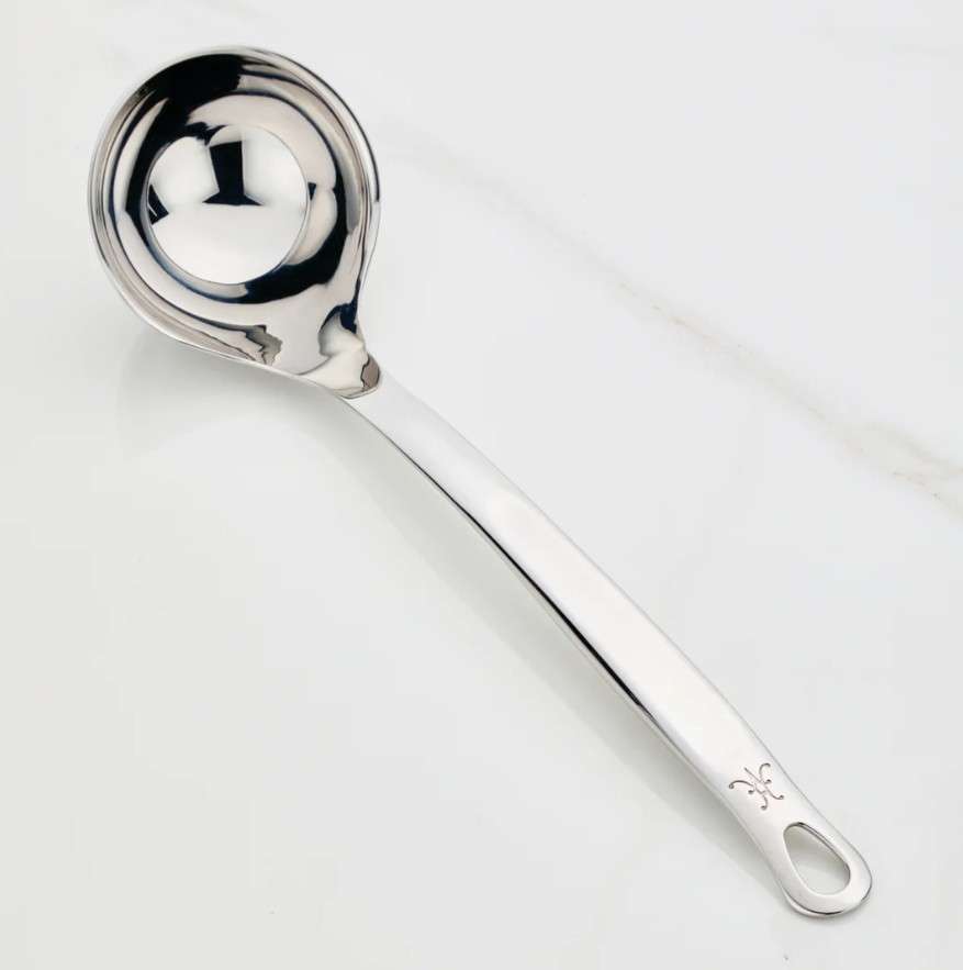 This 13-inch ladle features a beautifully precise stainless steel handle, deep 5-ounce bowl shape, and a perfectly balanced weight. With artisan-polished finish and Hestan monogram, it is easy to admire.