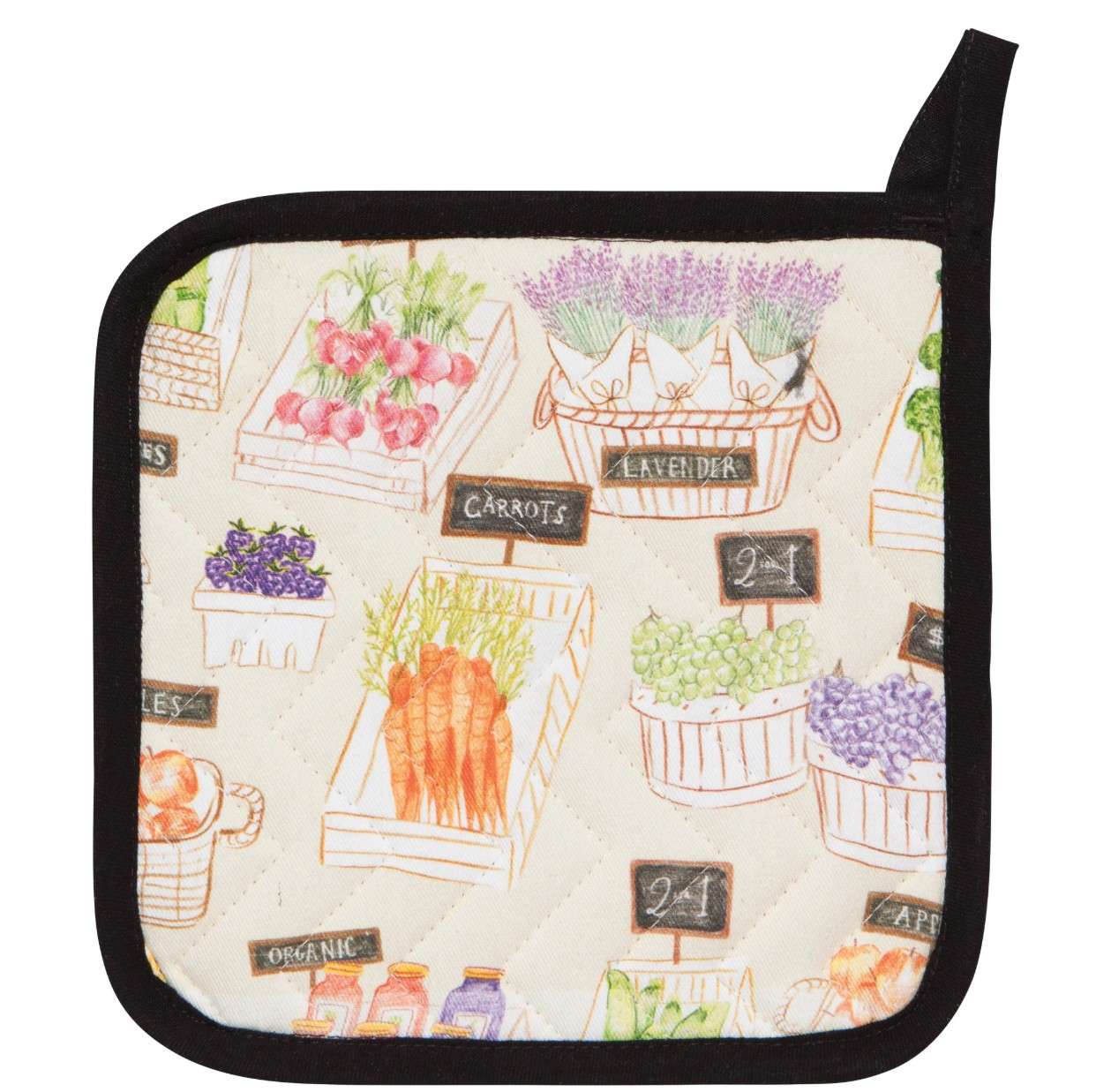 The sights and sounds of the farmer’s market radiate warmly with the Locally Grown Chef potholder. It offers major heat protection while lifting and moving items from your stove or oven. Made from 100% cotton with polyester fill, it measures 8 by 8-inches square. Part of the Locally Grown collection, this design is brimming with vibrant fruits, veggies, and flowers; smiling faces and words of welcome.