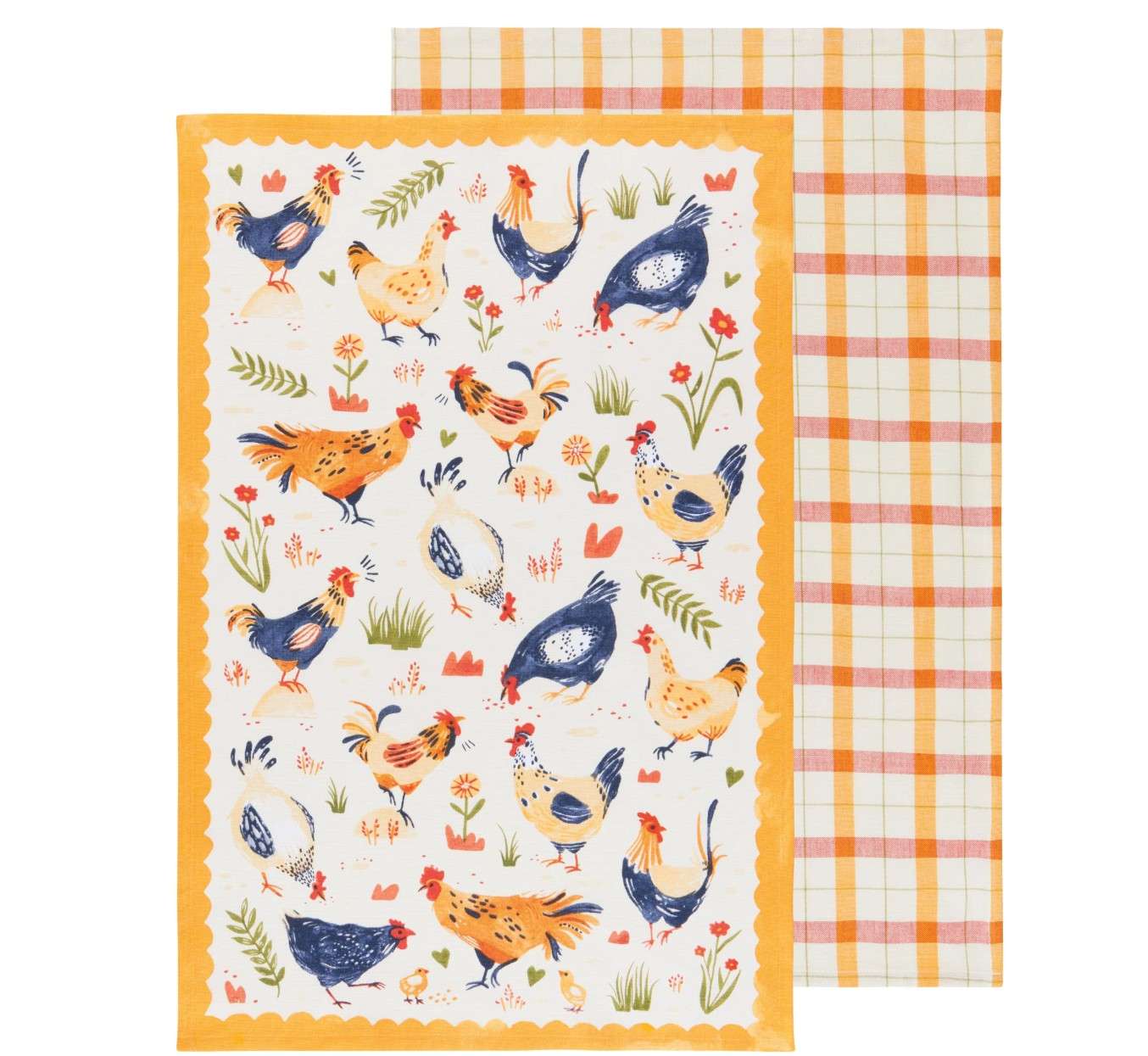Feathered friends rule the roost in the cozy farmyard scenes of the Free Range Printed dishtowel set. Why choose? Find the right balance of a lively pattern and a handsome plaid with this set of printed and woven cotton dishtowels. Part of the Free Range collection, the warm greens and yellows and country-kitchen creams and blues of this design are inspiring ingredients for farm-fresh cooking and baking.