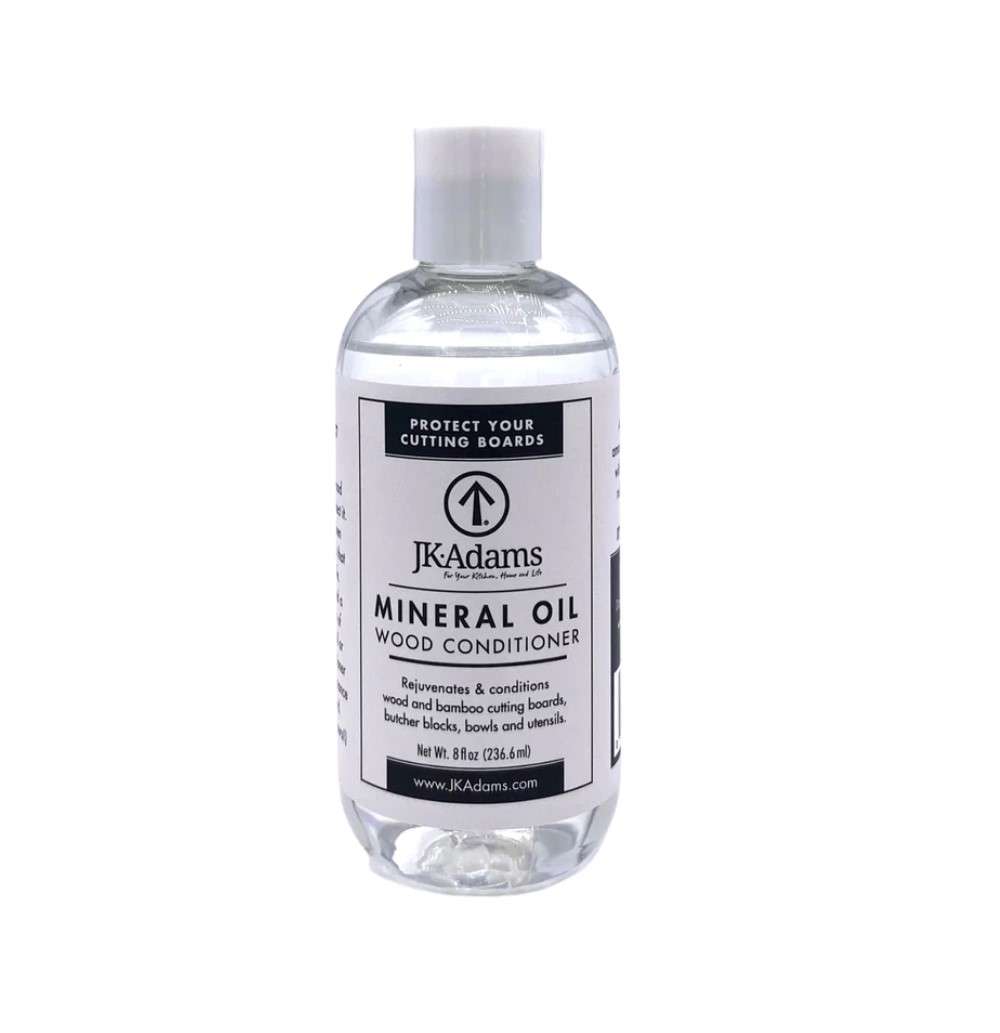 Mineral oil is a traditional cutting board oil that will help to condition the wood. Mineral oil is a classic butcher block conditioner. We recommend applying our mineral oil with a soft cotton cloth to rub the oil into the wood. Apply mineral oil more frequently in the winter months and or drier climates. When your board is rough to the touch apply mineral oil to condition and hydrate the wood. Our mineral oil has a plastic flip top to make application a breeze. Mineral oil will condition the wood and ensure your JK Adams’ pieces can be used and enjoyed for a lifetime. Available in two sizes.